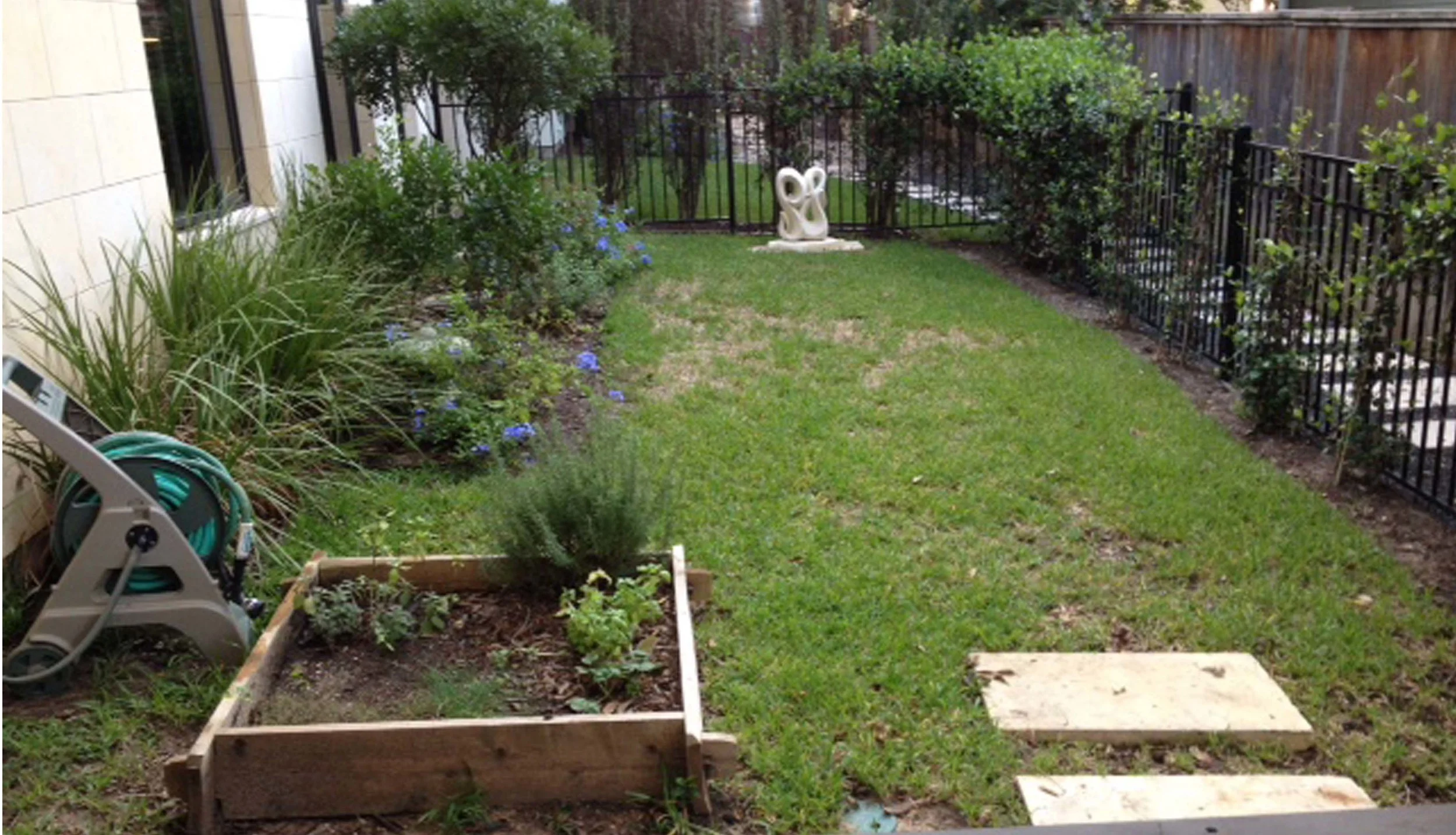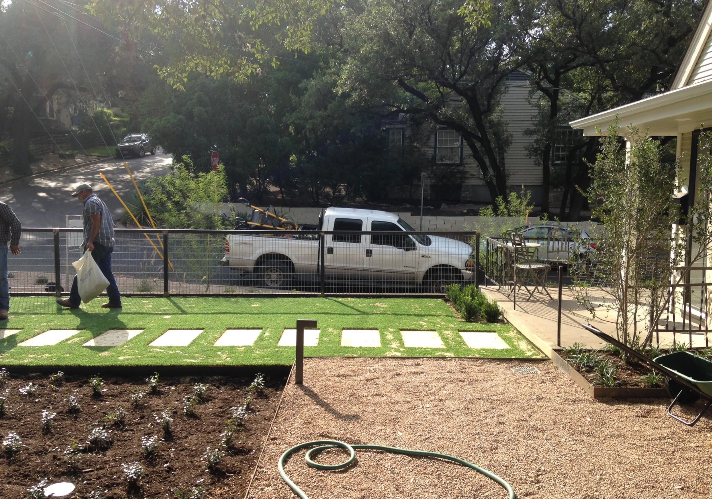 A tiny back yard and a thirsty front yard drove the design of this Travis Heights update. We replaced the grass with a syn lawn and a lower water ground cover and created a large entertaining area.