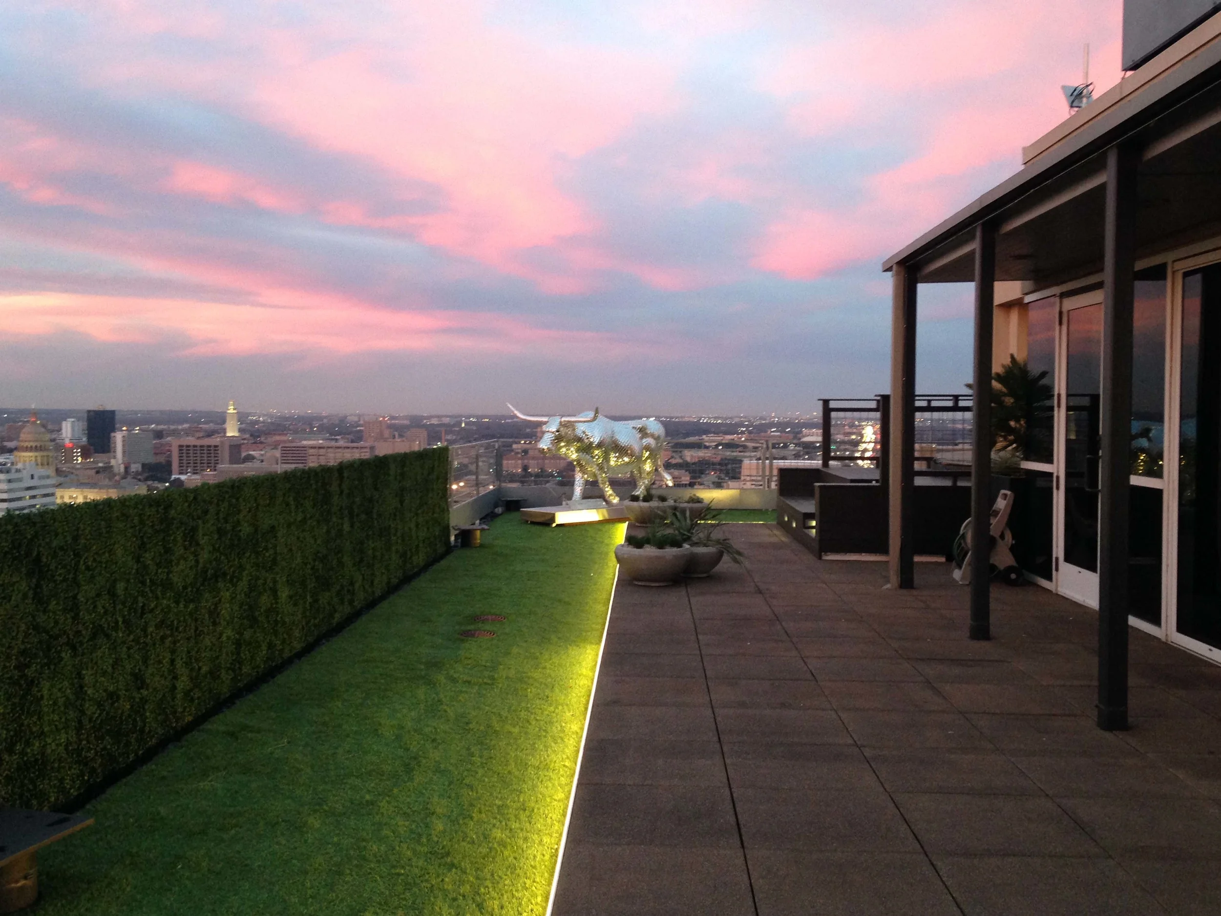 30+ floors above Austin, Texas Westshop created a roof garden filled with flora and fauna that blur the lines of what is a natural setting. The provided sculpture was part of the Longhorn Stampede charity event and for a great cause.