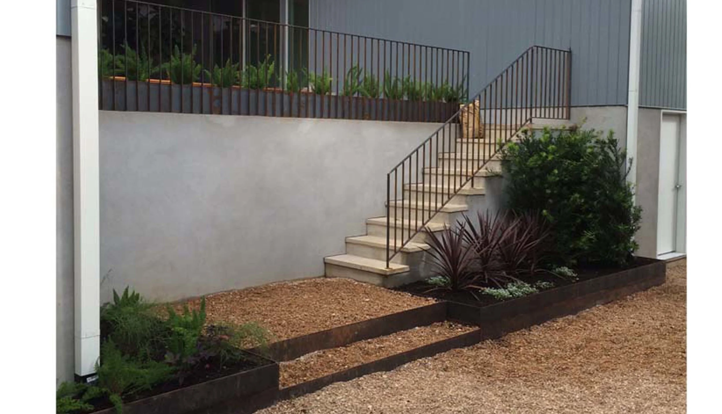 Stairs, railings, planters and more connect this Tarrytown landscape and its various levels. Things are growing in nicely and more photos coming soon!